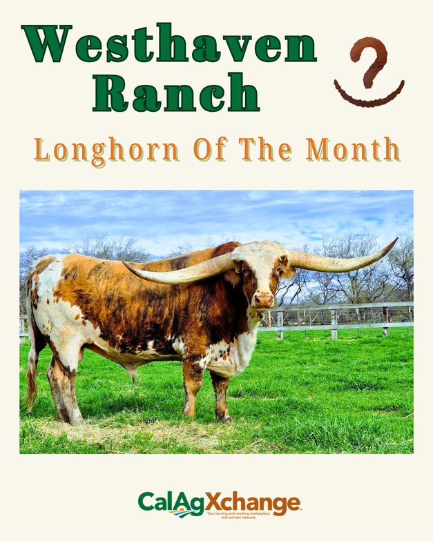 Westhaven is in the News! Westhaven Gold Voyager, our colorful 3.5 year old Longhorn bull is featured in Farm Bureau's CalAGXchange above.